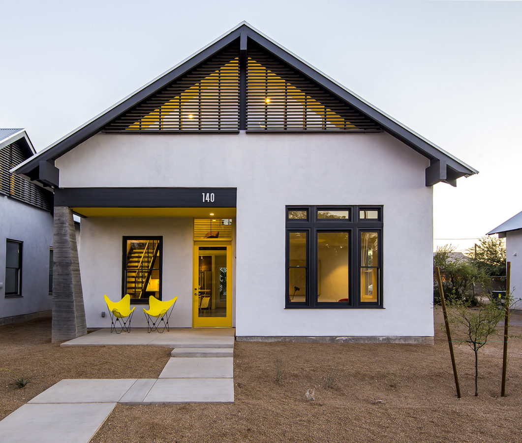 Urban living in Tucson reinvented. Placed in an empty lot of an Historic neighborhood the 18th Street bungalows embrace the fabric of the Armory Park Neighborhood on the outside while creating a modern, intriguing, double height loft on the interior.