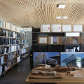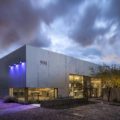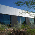 Inside, an undulating wood slat ceiling; think violin, creates an organic flowing space providing spatial interest and acoustic relief. A shared restroom core at the center of the building frees up interior space for each tenant to create a plan to suit their needs. Outside, lush desert landscaping and re-purposed concrete hardscape enliven the outdoor spaces throughout the site to create a virtual oasis with shade and plant color.