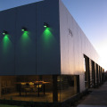 The Transformation begins with the exterior skin. In place of the existing standard metal building panel, a new skin of lightweight aluminum panels form a rain screen over a heavily insulated wall system. A bright white roof with high R-value encloses the building with south facing shaded monitor skylights at each of the four bays. Each of the original 10’x10’ Roll-up doors along the north façade are replaced with clear glass to provide views to the landscaped courtyard and mountains beyond. Additional apertures are inserted along the East and West of the building to expose hints of structure and activity inside. Along the South facade, a thin strip window runs high along the length of the building to maximize the natural lighting possibilities within the interior.