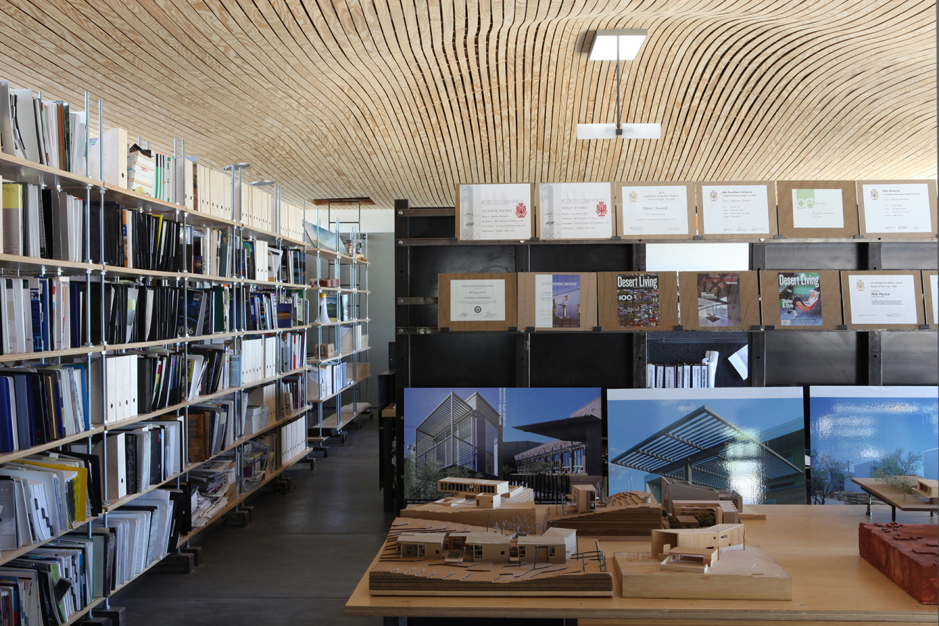 Inside, an undulating wood slat ceiling; think violin, creates an organic flowing space providing spatial interest and acoustic relief. A shared restroom core at the center of the building frees up interior space for each tenant to create a plan to suit their needs. Outside, lush desert landscaping and re-purposed concrete hardscape enliven the outdoor spaces throughout the site to create a virtual oasis with shade and plant color.