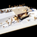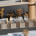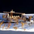 This house for a couple creates a large canopy between two volumes to maximize the indoor, outdoor living experience. Set on a deep wash with lush landscape, the three distinct parts of the house open up to the desert environment and distant mountain peaks. Inspiration from the couple’s love of Bali and living outdoors formed the open scheme in a lush desert setting complete with an outdoor kitchen, suspended daybed from the structure above, and built-in seating between different levels under the large shaded canopy.