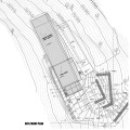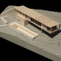 Primary circulation is limited to one edge of the building, providing an overall linear organization. Low ceilings and smooth directional surfaces finish out the scheme and draw the eye through the building and out to the landscape.